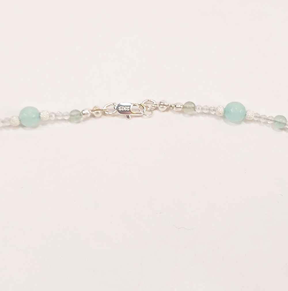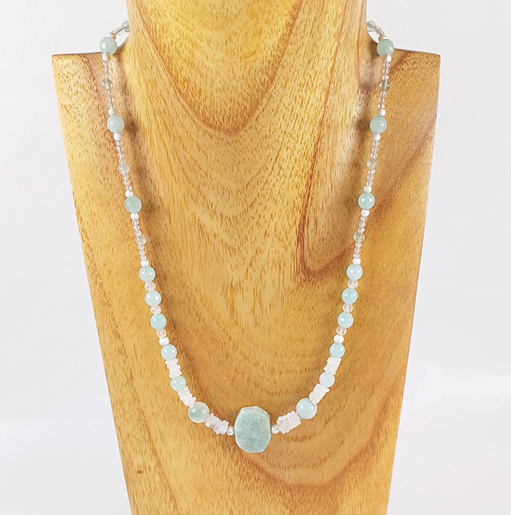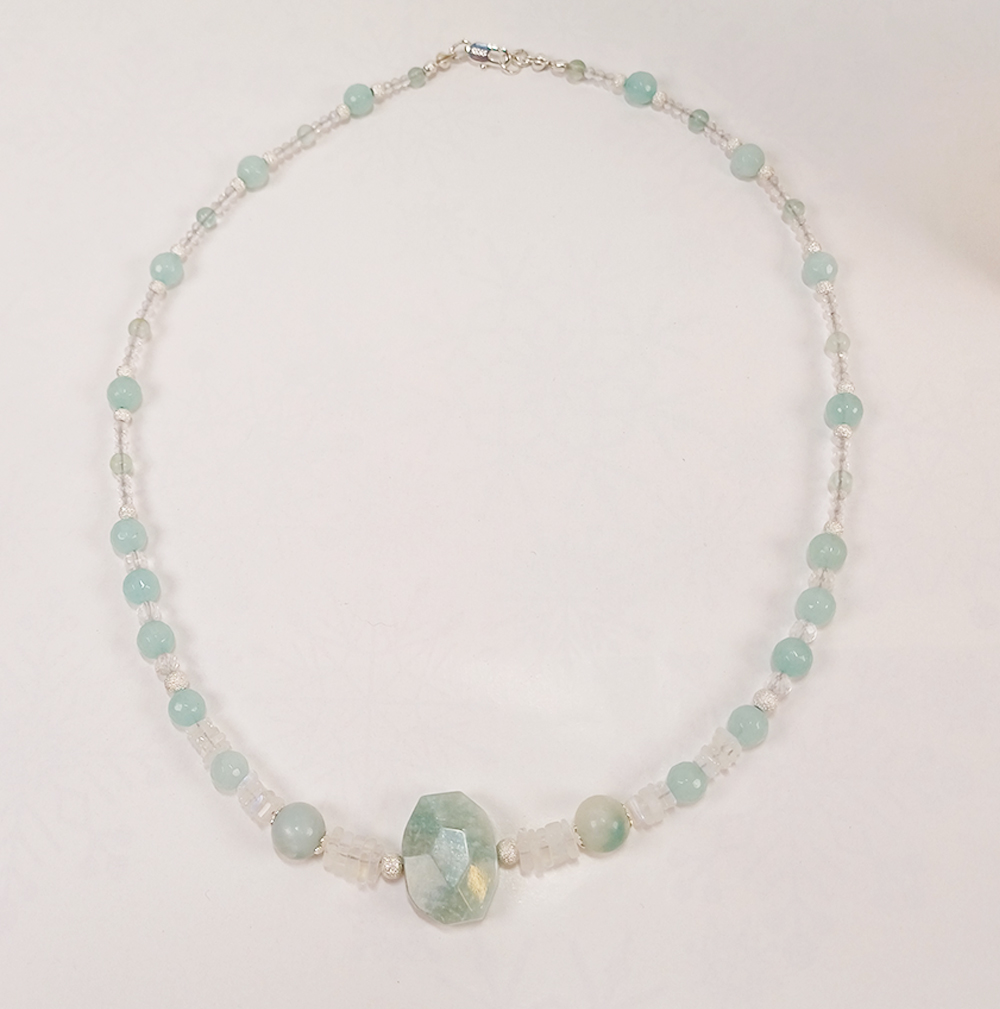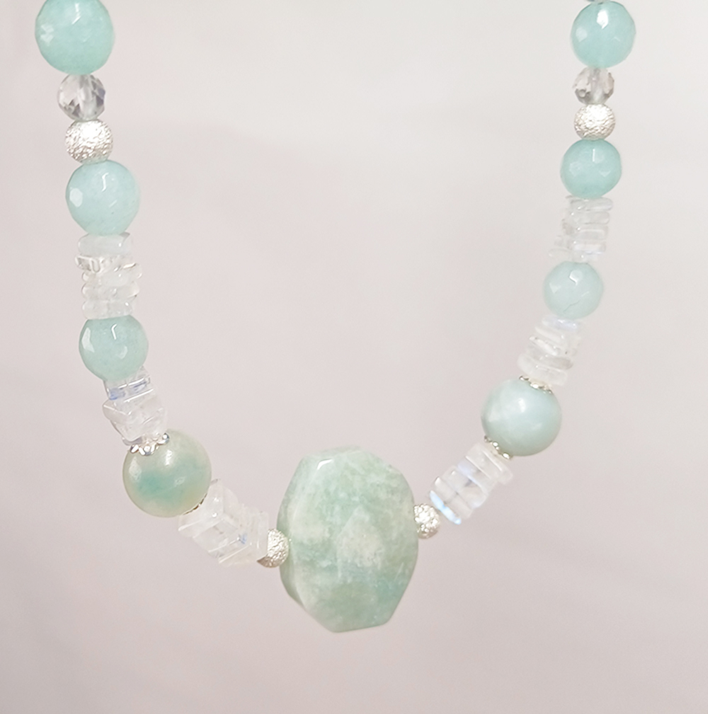 Collier mit Amazonit, Regenbogenmondstein und Bergkristall.