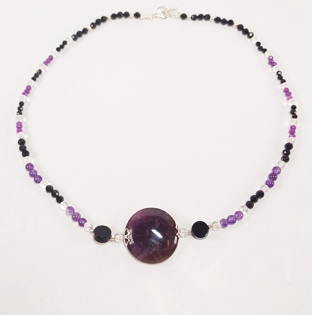 Collier mit Amethystscheibe und Perlen, Onyxmünzen; Kugeln aus Spinell, lila Achat, Bergkristall und mit Kugeln und Zwischenteilen aus 925 Silber.